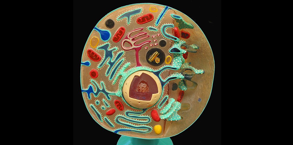 A protein called SWELL1 found in the cell membrane, shown circling the cell in teal in this model, may help cells control swelling and prevent them from popping.