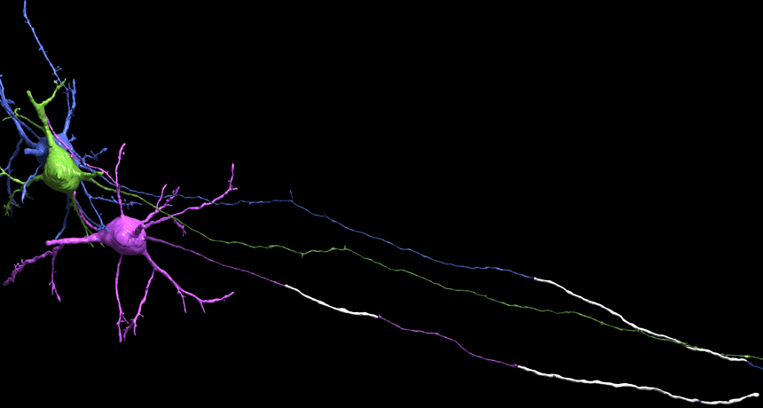 Three neurons show differences in their myelin sheaths (white), in this computer illustration.