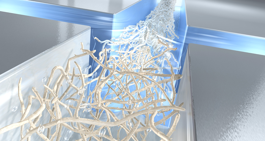 Jets of water accelerate cellulose nanofibrils, forcing them to align in the direction of the water flow, as shown in this artist's illustration. When the fibrils align and are left to dry, they lock together to form ultra-strong cellulose fibers.