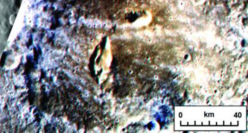 Two volcanic vents (center) on the floor of Mercury’s Kipling crater are shown in this false-color MESSENGER image. Volcanic ash appears in brown.