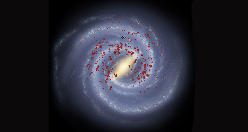 By mapping the the distribution of massive stars (red) in the Milky Way, astronomers have found evidence to reaffirm that the galaxy has four arms instead of two. The location of the solar system is circled in black.