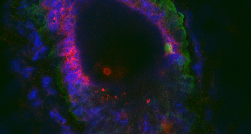 Nanoparticles (red) injected directly into mammary duct tissue (cell nuclei shown in blue and basement membrane shown in green) reduced tumor incidence by 75 percent in mice, a study shows.