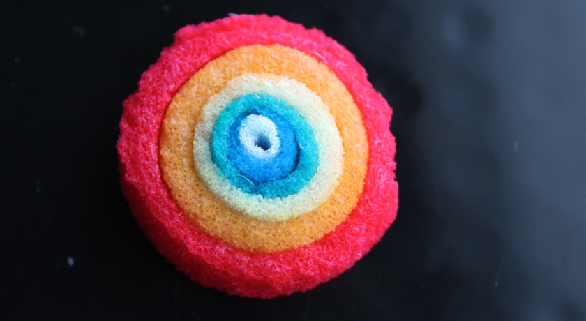 Silkworm cocoons provided the starting material for these concentric layers dyed with food coloring. Neurons populated the layers, which served as a scaffold for creating a three-dimensional model of a brain.