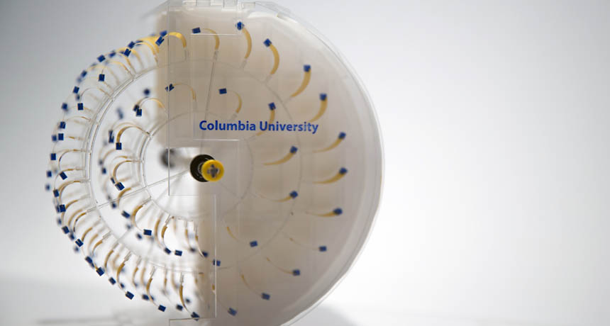 This spore-powered engine is called a "moisture mill." It turns as bacterial spores, attached to the yellow polymer flaps, shrink and swell based on varying levels of humidity.