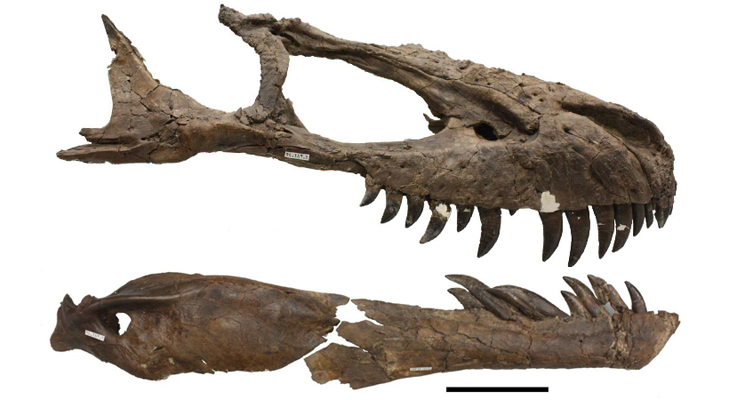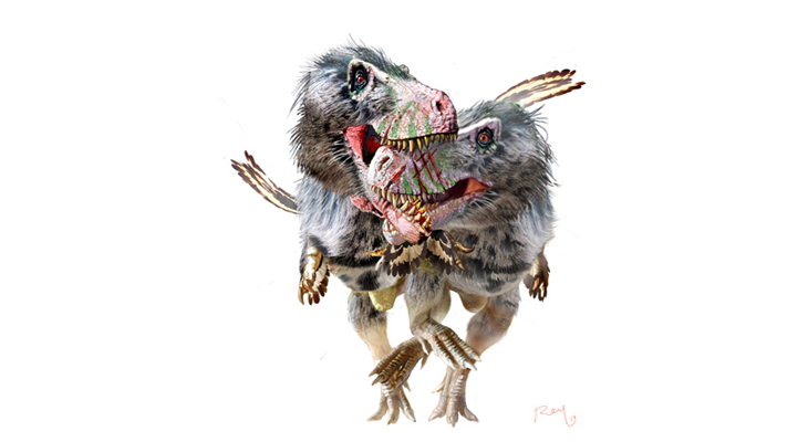 Tyrannosaurs, shown in this artist’s illustration, both hunted for food and scavenged, which is probably how bite marks ended up on the skull of a young Daspletosaurus unearthed at Canada’s Dinosaur Provincial Park.
