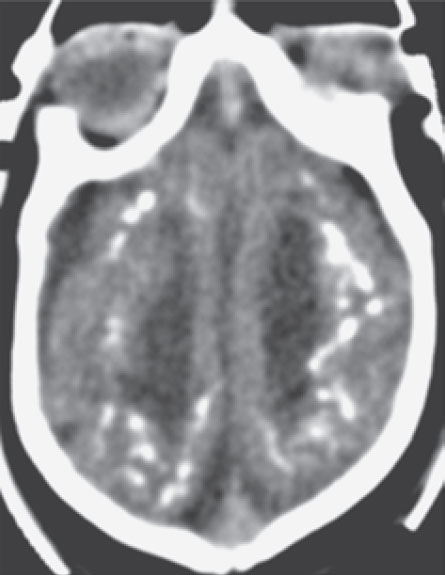 Inside the brain of this infant born with microcephaly (and with suspected Zika virus infection), researchers spotted bright white spots and streaks of calcifications, areas that represent damaged tissue. Researchers found similar damage in the 22 other microcephalic infants examined.