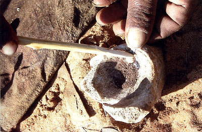 The larvae of Diamphidia nigroornata beetles produce a toxin that Ju|'hoan hunters collect for poison arrows.