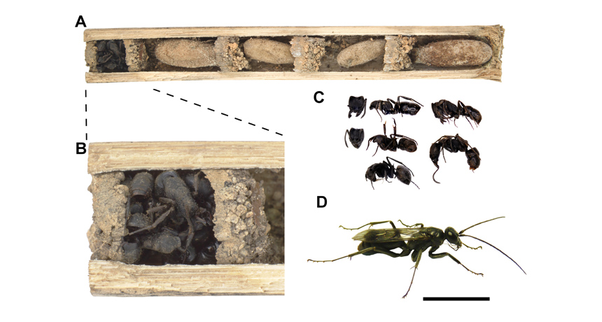 A newly discovered species of wasp (D) leaves its eggs in cavities (A) protected by dead ants (B and C).