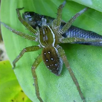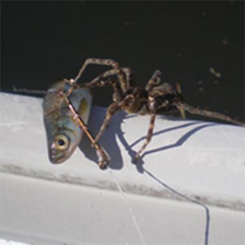 This adult Ancylometes spider feasts on a fish in Ecuador. Fishing spiders often consume prey much larger than themselves.