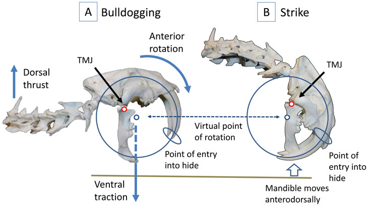 Then in 1985, a researcher at the Natural History Museum of Los Angeles proposed that the cat employed its lower jaw in the bite, providing an opposing force against which the downward motion of the top jaw could work.