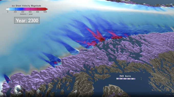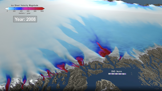 More evidence of global change came from Earth-observing satellites, which brought a new planet-wide perspective on global warming beginning in the 1960s. From their viewpoint in the sky, satellites have measured the steady rise in global sea level — currently 3.4 millimeters per year and accelerating, as warming water expands and as ice sheets melt — as well as the rapid decline in ice left floating on the Arctic Ocean each summer at the end of the melt season. Gravity-sensing satellites have ‘weighed’ the Antarctic and Greenlandic ice sheets from above since 2002, reporting that more than 400 billion metric tons of ice are lost each year.