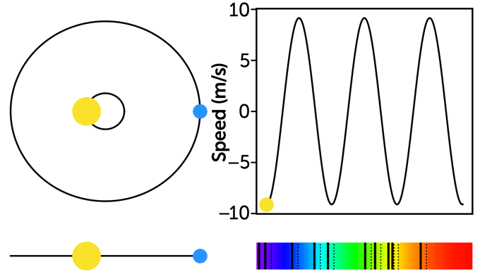 Instead, Mayor and others studied a shift in the wavelength of starlight as a star moved to and fro. As a star approaches us, the light shifts to shorter, or bluer, wavelengths; as it moves away, the light grows redder. Calculating the velocity of the star’s back-and-forth motion, astronomers could figure out the minimum mass and length of the year of whatever was tugging that star.