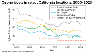 The air pollutant ozone has been linked to health problems including respiratory illness, reproductive problems and some cancers. Levels of ozone in the United States have come down over time but have started to rise again in places because of wildfires and soil emissions.