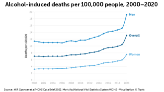 Alcohol-related deaths have increased yearly over the last 20 years. From 2019 to 2020, in the first year of the COVID-19 pandemic, the death rate from alcohol use rose sharply — at a much greater rate than in recent years.