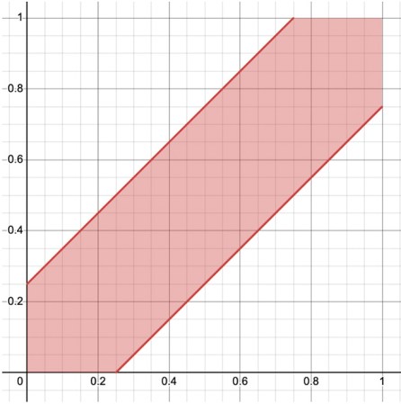 The entire region of possible arrival times to consider is the unit square, with corners at (0, 0), (1, 0), (1, 1) and (0, 1), which has area 1. For example, (0, 0) represents you both arriving at 3 p.m., (1, 0) represents you arriving at 4 p.m. and your friend arriving at 3 p.m., etc. But not every point in the square represents you and your friend meeting each other. To successfully meet, you and your friend had to arrive within 15 minutes (or one-quarter hour) of each other. Mathematically, that meant either x−y (how much earlier your friend arrived than you did) had to be at most 1/4 or y−x (how much earlier you arrived than your friend did) had to be at most 1/4. These two inequalities could be written more concisely as a single inequality: |x−y| ≤ 1/4.