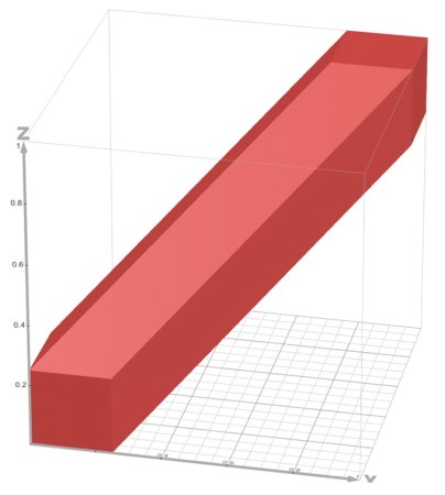 #2. The next problem asked you to consider three total friends. With two friends, the probability they met was the area of a hexagon inside a unit square. With three friends, you now had to consider a unit cube, with coordinates of x, y and z representing the three arrival times. All three friends meet when their arrival times are within 15 minutes of each other: |x−y| ≤ 1/4, |y−z| ≤ 1/4, and |z−x| ≤ 1/4. These three inequalities were all true in the region below, whose volume represented the probability of all three meeting.