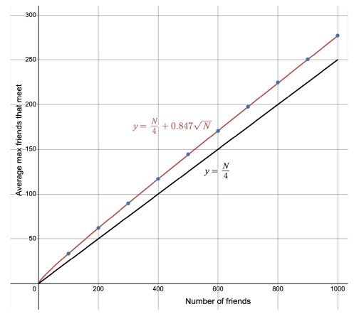 The “clumpiness” of arrival times — or how much greater the true average maximum is than N/4, turns out to scale with the square root of N. The graph below shows how N/4 + 0.847√N is an excellent approximation of the true behavior up to 1,000 friends. As N gets very large, the term that’s proportional to N grows much larger than the term that’s proportional to √N, so that the ratio between the average maximum number of friends who meet and N indeed approaches 1/4.