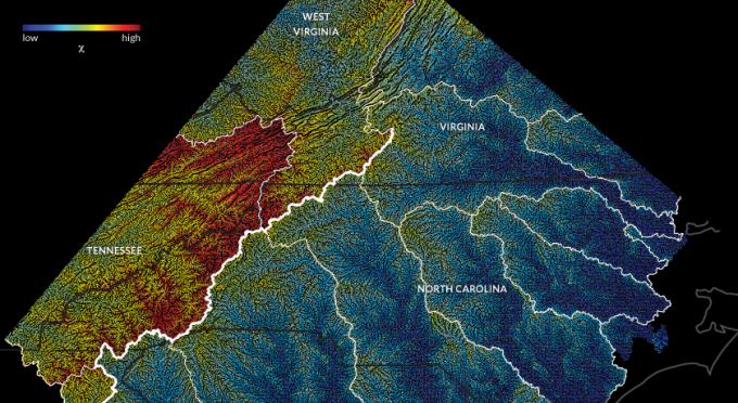 A river’s erosion downward and across a landscape is based on a variety of factors, including terrain steepness and the arrangement of tributaries.